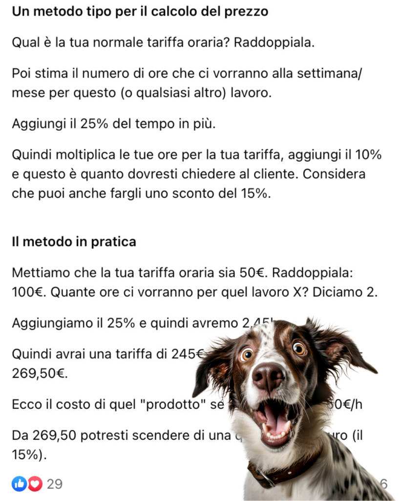 Qualche tempo fa mi sono imbattuta nel post di una freelance che chiedeva consiglio a un gruppo Facebook di professionisti su quanto far pagare una singola newsletter a un’azienda. La cifra finale era di circa 250 €. Ecco, io ho scelto di lavorare con clienti che se gli dico che una newsletter gli costa 250 € dopo devo chiamare un’ambulanza.